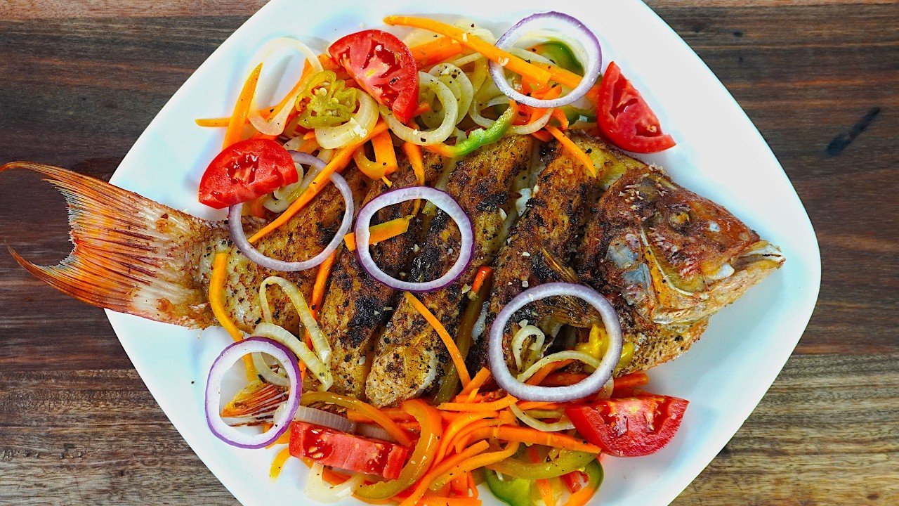 Pan fried market selected fish topped with a sweet and tangy sauce Garnished with peppers and onions. Try it brown stewed as well!